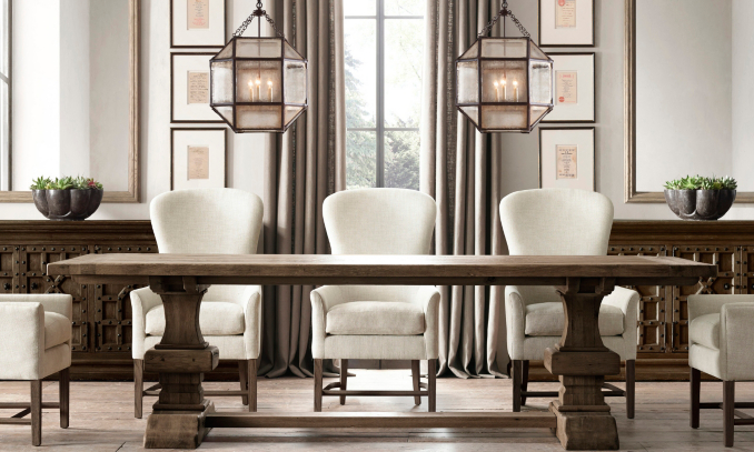 Take for example the table pictured above, this is a table that is sold at restoration hardware. It is a beautiful table made out of wood finished to have a "brushed" look to it. Finding an old table in this style shouldn't be too hard to find if you know where to look, a quick search online will point out your local thrift stores and antique shops. To achieve the "brushed" look, you have to be sand down the table and add the right type of varnish by hand. Asking the right questions to your preferred home improvement store's representative will get you the right varnish, you can probably even take a picture of what you want to achieve and they'll help you find it.