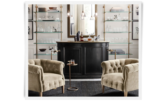 Check out this awesome bar made from an old cabinet painted in white. Old cabinets are a dime a dozen, finishing a cabinet with black paint and shiny gold paint at the top should not be a challenge for most people. We especially like how expensive and high end this room looks with vintage looking chairs and old school bar set. A lot of these ideas can be done on a budget and if you're not on a budget you can always visit www.restorationhardware.com to buy some of these great pieces.